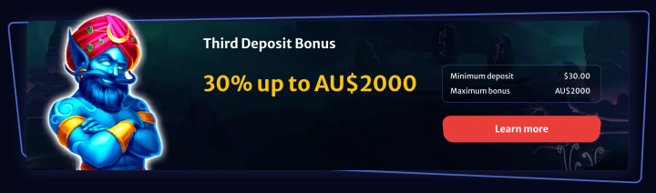 - 3rd Deposit: 30% up to A$2,000