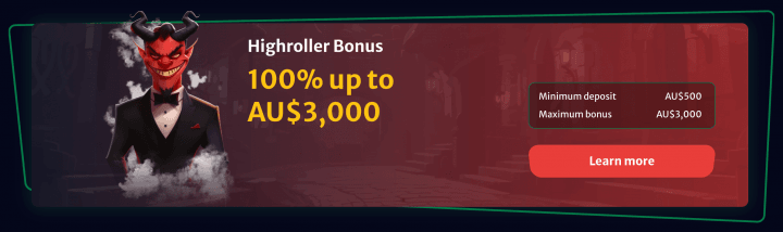 Another path for newly registered players is a Highroller Bonus – a 100% bonus up to A$3,000 on your first deposit (the minimum deposit is A$500). You can choose it as an alternative to the standard 1st deposit bonus.