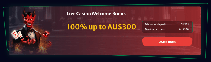The third welcome option is the Live Casino Welcome Bonus – a 100% match up to A$300 (the minimum deposit is A$25) that applies to the 1st deposit only.