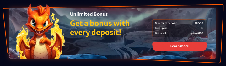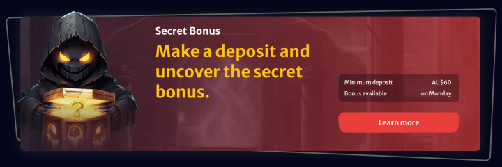 This weekly bonus is available on Wednesdays. To qualify, you should deposit at least A$30. You receive 50 FS immediately, and the next batch of 50 FS is credited to you the following day. The wagering requirement is 40x.