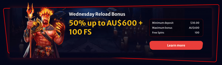 Wednesday Reload – 50% up to A$600 + 100 Free Spins