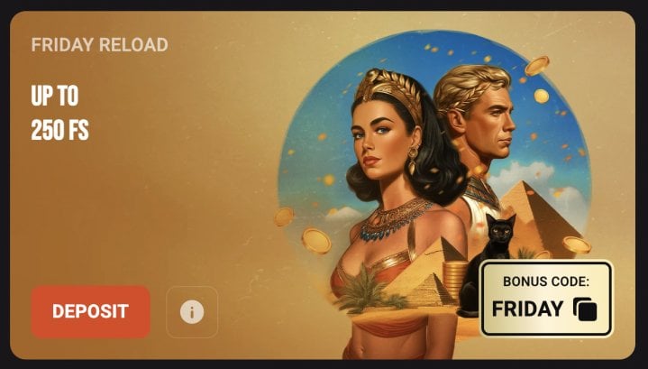 - Friday Reload: Escalating spins based on Friday deposits – 1st deposit: 20 spins, 2nd: 30, 3rd: 40, climbing to 65 on your 6th deposit. All on Big Bass Splash (FRIDAY). Minimum €20 / C$30 / A$32 / NZ$35. 40x wagering.