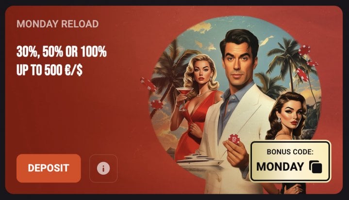 - Monday Reload: Tiered matches – 30% at €30 / C$45 / A$48 / NZ$53, 50% at €50 / C$75 / A$80 / NZ$88, or 100% at €100 / C$150 / A$160 / NZ$175 capping at €500 / C$750 / A$800 / NZ$875 (MONDAY). 40x wagering. Once weekly.