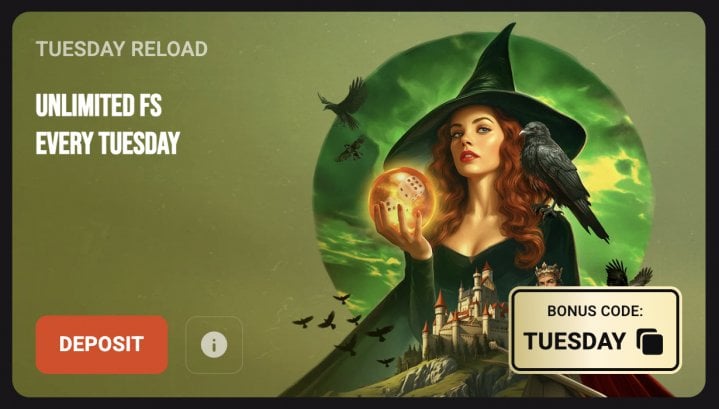 - Tuesday Reload: Free spins day, unlimited claims. 50 spins at €30 / C$45 / A$48 / NZ$53, 100 spins at €50 / C$75 / A$80 / NZ$88, or 200 spins at €100 / C$150 / A$160 / NZ$175 on Gates of Olympus Super Scatter (TUESDAY). 40x on winnings. Claim all day if you're depositing multiple times.