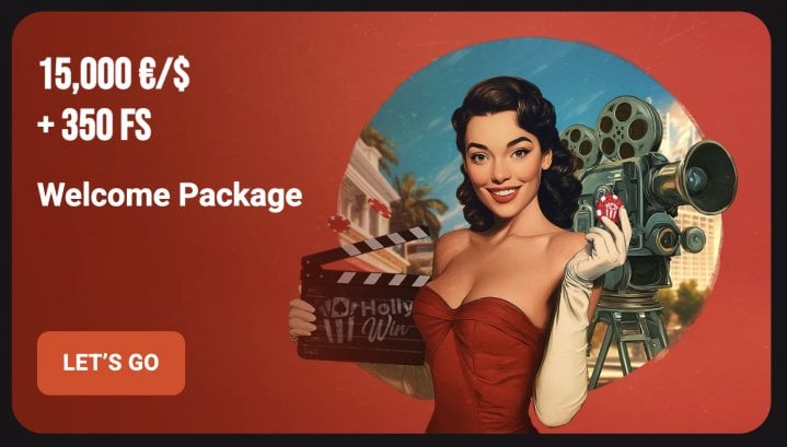 HollyWin spreads its welcome package across four deposits totaling €15,000 / C$22,500 / A$24,000 / NZ$26,250 plus 350 free spins. Free spins land mostly on deposits one and three.