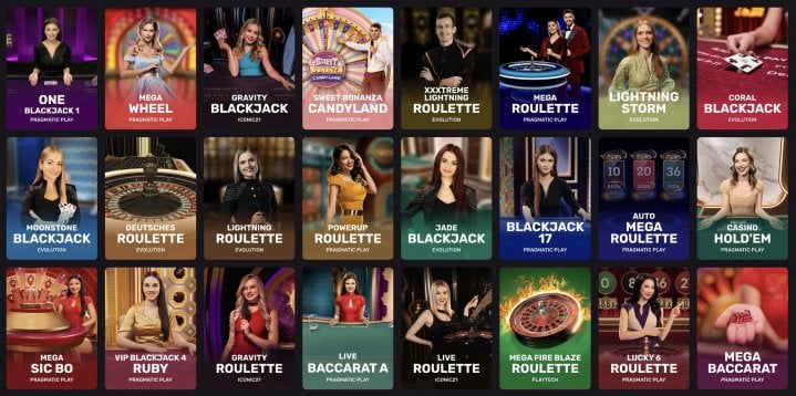 Live dealer tables pull from Evolution, Pragmatic Play, and Iconic21.