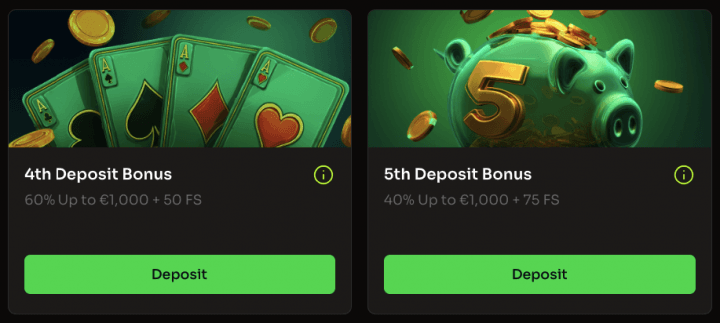 - Fourth Deposit: 60% up to €1,000 and 50 free spins