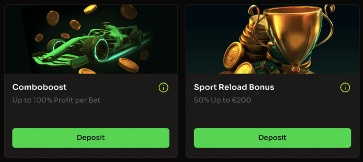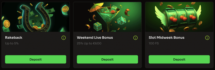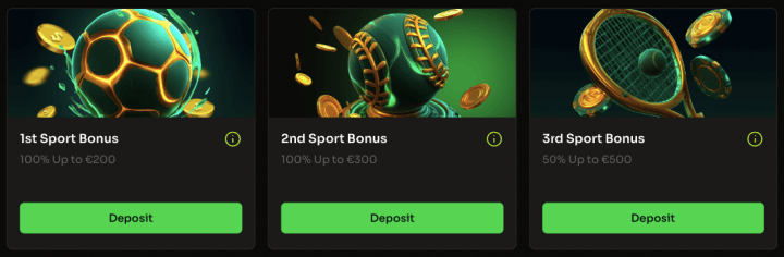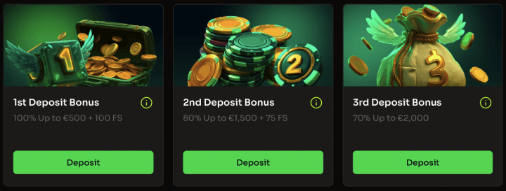 After signing up via email, Gmail or your Apple account, when you make your first deposit, you can claim a first deposit bonus worth up to €500 + 100 free spins. After this, you can claim four more deposit match deals.