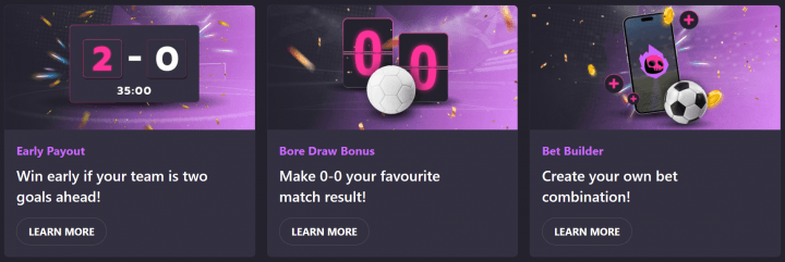 - Special Sports Bets: If you fancy a flutter on sports without having to deposit, then you can take advantage of special bets such as ‘Bet Builder’, ‘Bore Draw’, ‘Early Payout’ and ‘0% Margin’ deals.