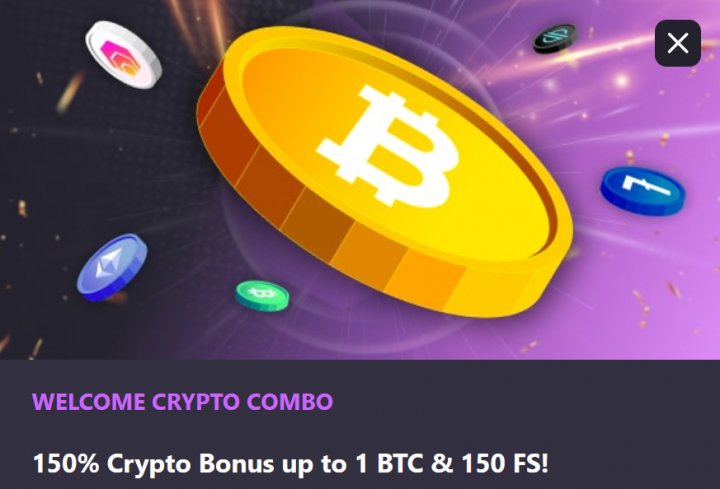 - First Deposit: 150% Crypto Bonus up to 1 BTC & 150 FS