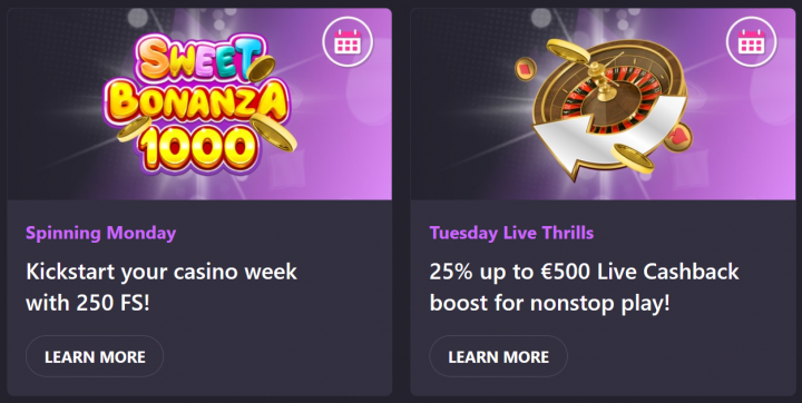 - Spinning Monday: To start the week on dreaded Mondays, you can earn 250 free spins on Sweet Bonanza 1000 when you deposit €50 / C$50 / A$50 / NZ$50. The rollover for this offer is 35x your FS winnings.