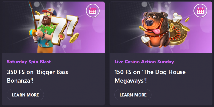 - Saturday Spin Blast: On the first day of the weekend, you’ll receive 350 free spins on Bigger Bass Bonanza for every €1 / C$1 / A$1 / NZ$1 deposited, starting with a minimum of €25 / C$25 / A$25 and going up to a maximum of 350 free spins for higher deposits.