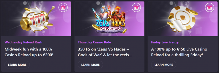 - Wednesday Reload Rush: As a mid-week promotion, you can deposit €25 / C$25 / A$25 / NZ$25 for a 100% deposit match reload up to €200 / C$200 / A$200 / NZ$200. However, the 35x (deposit + bonus) rollover isn’t ideal.