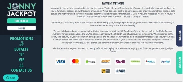 Jonny Jackpot has deposit and withdrawal option s that are available to players globally, and the casino uses 128-bit encrypted connections to process transactions securely. Head over to the cashier section on the menu where you will find currencies and financial companies that can be used to interact financially with the casino.