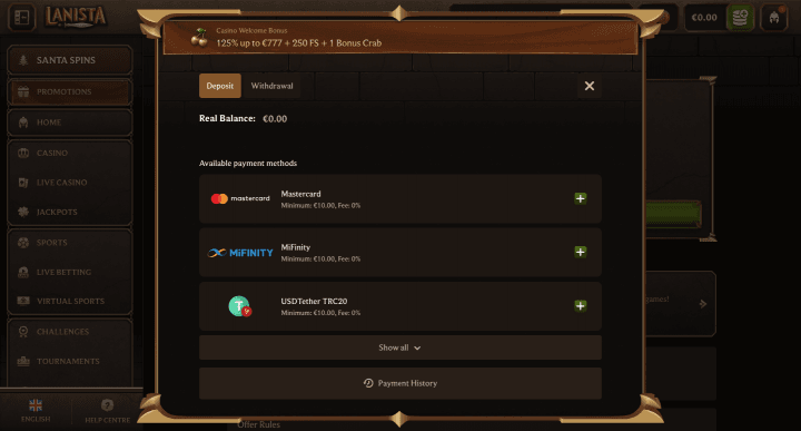 The minimum deposit required to get started at Lanista is a standard €20 / C$10 - C$20 / A$10 - A$20 / NZ$20 - NZ$25 across most banking and cryptocurrency options, with Bitcoin as the only exception, which requires at least €30 / C$45 / A$45 / NZ$65. After checking all the payment solutions listed in the cashier, we can confirm that none incur any additional fees charged by the casino.