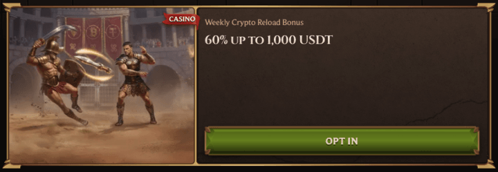 - Weekly Crypto Reload: Crypto players making deposits during the week can consider a 60% match deposit worth up to 1,000 USDT. It comes with a low 30x wagering requirement (bonus-only), but winnings are capped at 5x the bonus amount received.