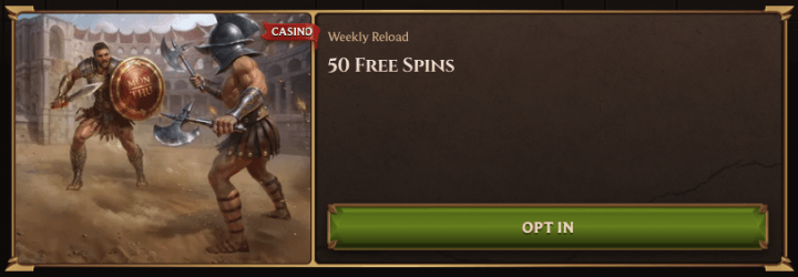 - Weekly Reload: Each week, Monday through Thursday, a 50-free-spin reload is available with a minimum deposit of €20 / C$30 / A$30 / NZ$40. Any winnings earned from those spins are subject to a 40x rollover that must be met within 7 days.