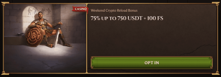- Weekend Crypto Reload: The weekend crypto offer also comes with a 30x wagering requirement and is worth 75% up to 750 USDT plus 100 free spins. A minimum deposit of 75 USDT is required to claim, and, again, the maximum conversion is 5 times the bonus amount.