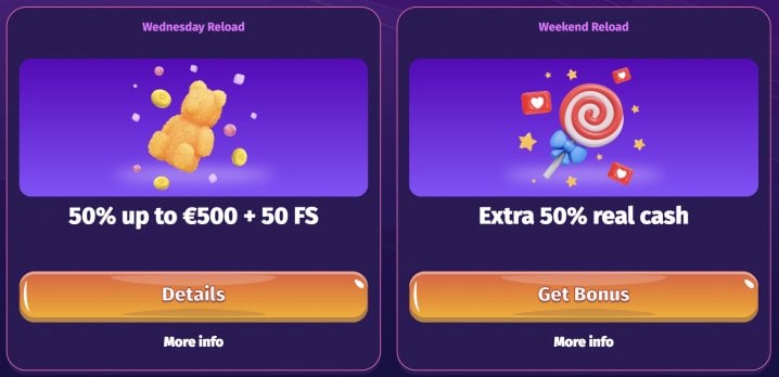 - Wednesday Reload: Each Wednesday, players can boost their deposits with a reload bonus worth 50% up to €500 / C$815 / A$890 / NZ$1,000 and 50 free spins on the Break the Piggy Bank slot. A minimum deposit of €25 / C$40 / A$20 / NZ$50 is required to claim the offer, and the same wagering requirements as the welcome package apply.