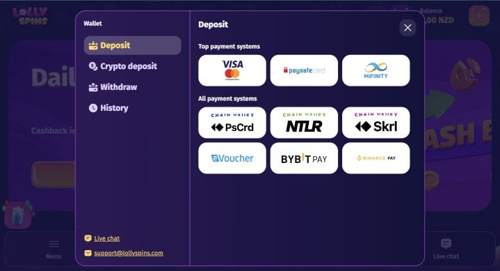 Lolly Spins offers flexible payment options for both deposits and withdrawals. Traditional users can choose from bank cards and e-wallets for straightforward transactions, while cryptocurrency enthusiasts have access to multiple digital currencies, exchanges, and fiat-to-crypto on-ramps for added convenience.