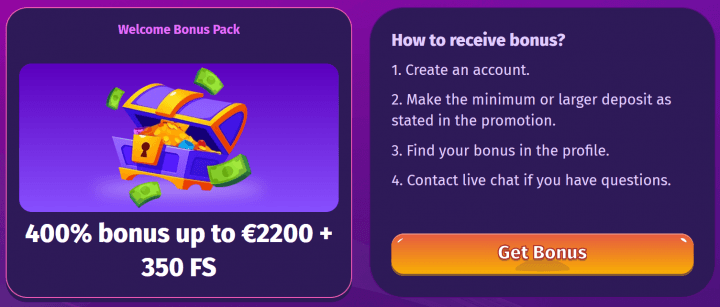 Online Casino Welcome Bonus - 400% up to €2,200 / C$3,585 / A$3,915 / NZ$4,400 + 350 Free Spins