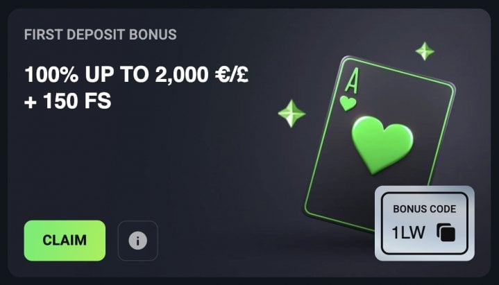 - First Deposit (1LW bonus code): 100% up to €/£2,000 + 150 free spins on Coin Strike: Hold and Win by Redgenn/Playson or on Fruit Million by BGaming.