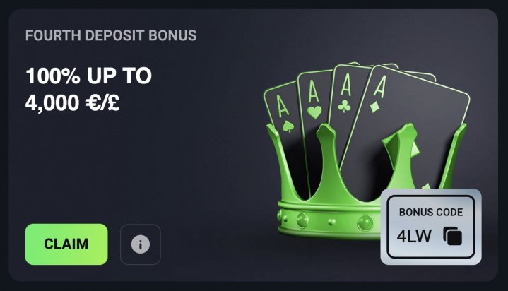 - Fourth Deposit (4LB bonus code): 100% up to €/£4,000