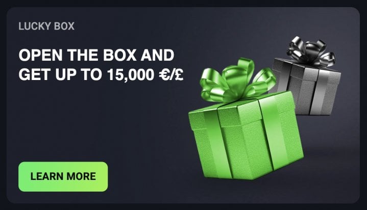The Lucky Box promo gives you a random reward each time you deposit and enter the EPIC or RARE bonus code. Prizes range from free spins with 30x wagering to large cash drops with 5x wagering.