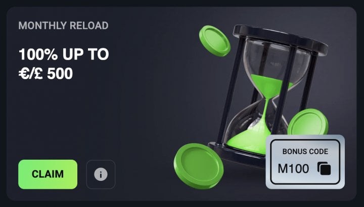 - Monthly Reload: Available once per month, this reload matches your deposit 100% up to €/£500 with code M100, requires a minimum deposit of €/£20, and comes with a 40x rollover.