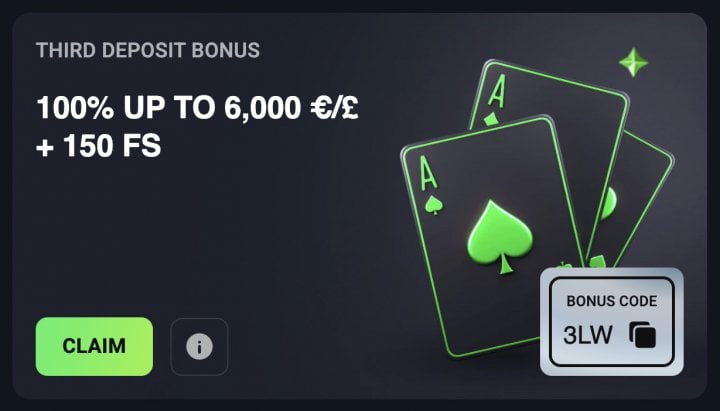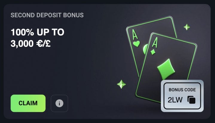 - Second Deposit (2LW bonus code): 100% up to €/£3,000