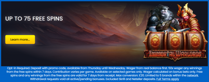 - 75 Free Spins: A £10 deposit with the bonus code WARLORDS25 gives you 25 free spins on the Immortal Warlords online fruitie game. You can use the same promo code three times for a total of 75 spins. Just note that all free spins winnings are subject to a 50x wagering requirement.