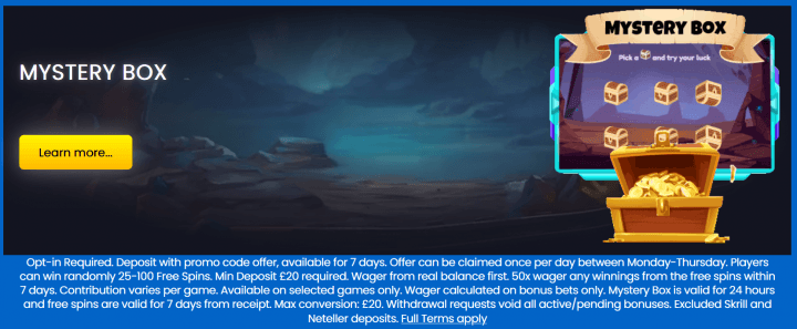 - Mystery Box: This promotion runs Monday to Thursday and requires a £20 deposit with the bonus code MBOX to claim a daily prize of 25 to 100 spins. You will likely land the lower-end 25 or 35 free spins, which, according to MonsterCasino, accounts for nearly three-quarters of outcomes, while the top 100-spin prize is rare. Regarding your winnings, a 50x rollover applies.