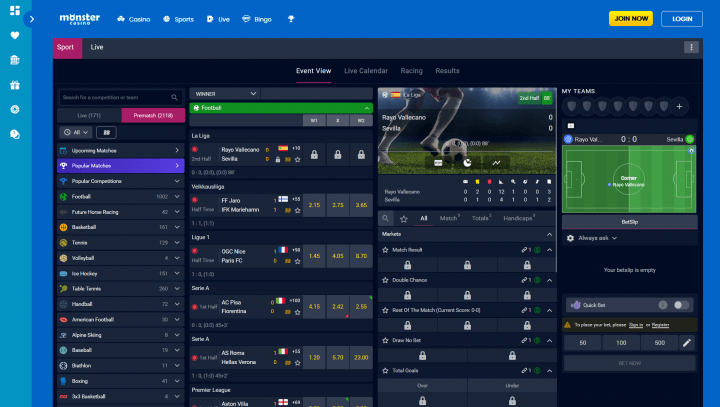 The sportsbook at MonsterCasino covers major markets, with football among the highlights, offering competitive odds and live betting across leagues and tournaments. Having both a casino and a sportsbook in one place means you don’t need a separate sports betting account, which is an advantage over casinos that only focus on slots and table games.