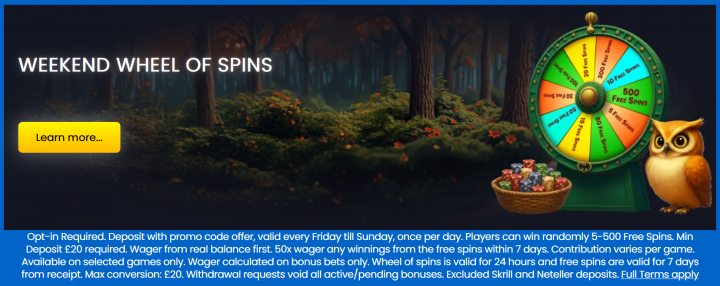 - Weekend Wheel Of Spins: The Mystery box gives you mid-week action, while the Weekend Wheel of Spins gives you the chance to win free spins over the weekend. From Friday to Sunday, you can earn one spin per day by depositing £20 along with the WKND500 bonus code. Prizes range from 5 to 500 free spins, with all winnings carrying a 50x wagering requirement.