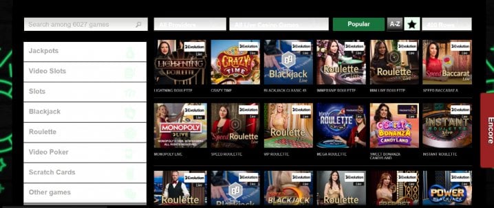 The homepage comprises a black and neon green color scheme with some nice background artwork and a support bar at the top right where you can change currency as well as reach live chat and customer support telephone details. There is a neat search bar that remains on the bottom as you scroll down through the lobby. Overall, a clear and tidy layout enables you to navigate around the site effortlessly.