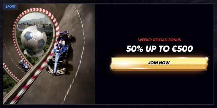 - Weekly Sports Reload – 50% up to €500 / C$750 / A$750 / NZ$1,000: Once per week, claim via live chat after settling qualifying bets. Minimum deposit €20 / C$30 / A$30 / NZ$40. Wagering is 8x on the deposit amount. 30-day validity.