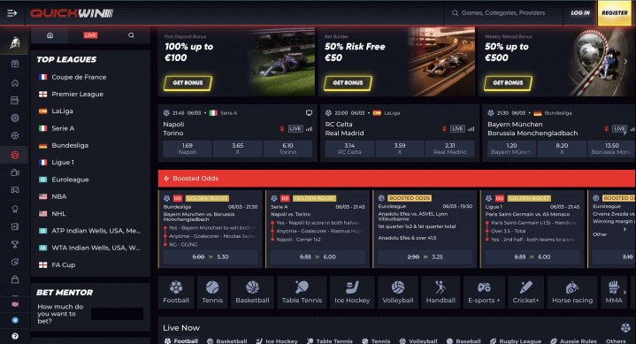 QuickWin's sportsbook covers 30+ sports with a strong live betting component. Football alone carries 999+ live events at peak times, alongside Tennis (323), Basketball (482), Ice Hockey (338), and niche options like Darts, MMA, Greyhounds, and Horse Racing. Bet Builder, Boosted Odds, Early Payout, and Bore Draw refunds are all available pre-match. The Accumulator Boost scales up to 100% on 21+ selections. Competitive odds and solid market depth suit both casual bettors and higher-volume players comfortably.
