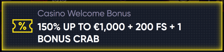 - First Deposit: 150% up to €1,000 / C$1,500 / A$1,500 / NZ$2,000 + 200 Free Spins + 1 Bonus Crab