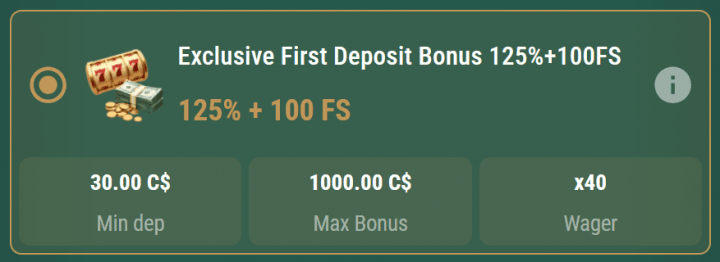 Use PlayCasino's affiliate link for your first deposit, and you'll claim 125% up to €1,000 / C$1,500 / A$1,500 / NZ$2,000 with 100 free spins attached. Compared to the standard opener (100% to identical caps), this exclusive version gives you that extra 25%. Worth grabbing if you're only claiming one welcome offer.