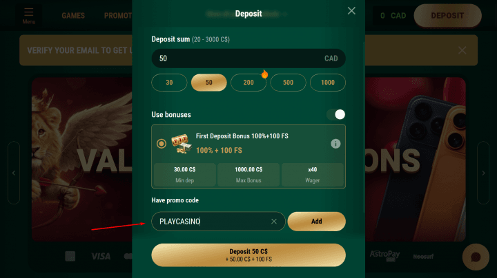 You'll need €20 / C$30 / A$30 / NZ$40 to activate it. The bonus activates at the cashier area with the promocode PLAYCASINO. Free spins follow the same terms as the welcome package spins below.