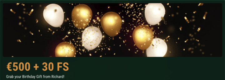 - Birthday Bonus: Your birthday arrives, Richard Casino emails a unique code. Minimum €20 / C$30 / A$30 / NZ$40 deposit unlocks 100% up to €500 / C$750 / A$750 / NZ$1,000 plus 30 free spins. Same terms: 40x wagering, 14-day window.
