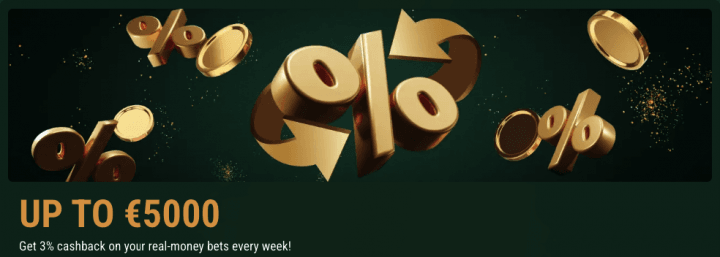 - 3% weekly cashback up to €5,000 / C$7,500 / A$7,500 / NZ$10,000