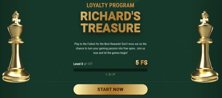 Richard's Treasure loyalty program spans 177 levels. You earn comp points by wagering: 1 CP per €25 / C$37.50 / A$37.50 / NZ$50 on slots, or 1 CP per €200 / C$300 / A$300 / NZ$400 on live casino games. Each level-up rewards you with 5-150 free spins.