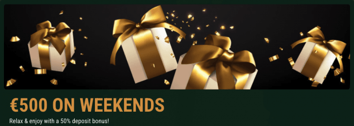 - Weekend Reload: Drop at least €20 / C$30 / A$30 / NZ$40 between Saturday 00:01 and Sunday 23:59 UTC. Use code WEEKEND. Claims you 50% up to €500 / C$750 / A$750 / NZ$1,000. Forty times wagering on deposit plus bonus. Expires after 14 days. Once per weekend.