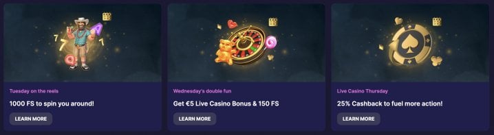 - Wednesday’s Double Fun: Wager at least €50 / C$50 / A$50 / NZ$50 on live casino games on Wednesdays and you will receive a €5 / C$5 / A$5 / NZ$5 live casino bonus and 150 free spins. Both come with 35x wagering requirements, with seven days to meet them.
