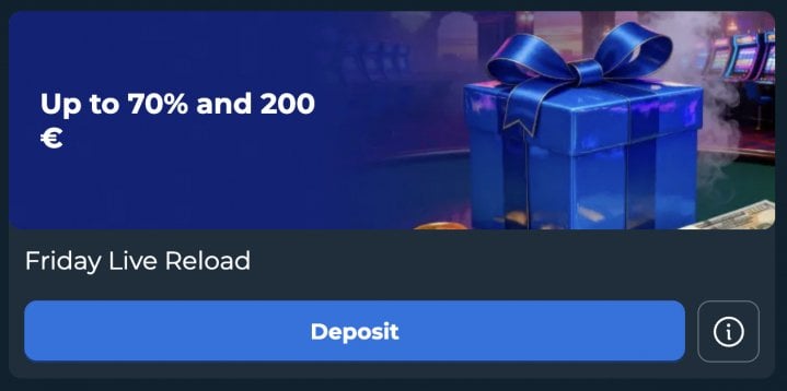 - Friday Live Reload: To kick-start the weekend, there is a live casino reload bonus that differs in size and value depending on the size of your deposit. You have five days again to meet a 35x (bonus-only) rollover requirement. The options are: