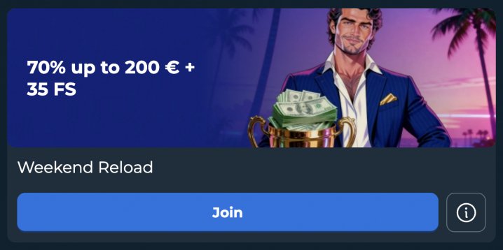 - VIP Reload: For high rollers, there is a VIP reload bonus that is available for deposits of €50 / C$80 / A$80. It is worth up to €500 / C$700 / A$700 and comes with a 35x (bonus only) playthrough requirement. The maximum bet allowed for this offer is double that of the others, with bets up to €10 / C$15 / A$15 permitted.