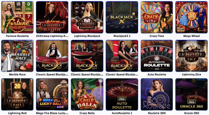 The live casino section feels more like a modern TV game show than a traditional casino floor. The available games include:
