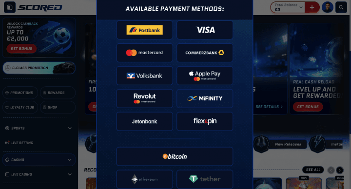 Scored Casino supports a mix of conventional payment methods and a wide array of cryptocurrencies, giving you flexibility in how you manage your funds: