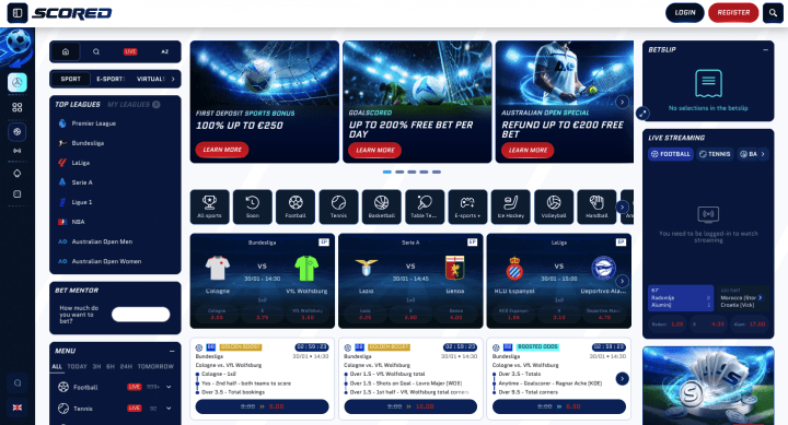 Scored’s main strengths are its integrated sportsbook and casino, a large progressive jackpot selection, and multiple loyalty systems. This appeal is held back by the strict terms attached to its bonuses.